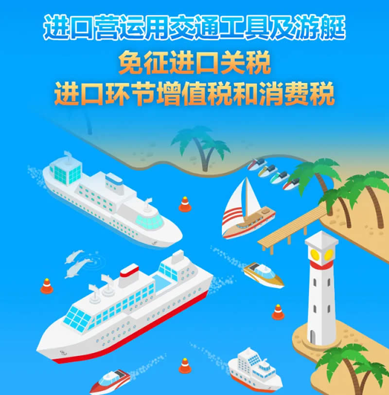 对岛内进口用于交通运输、旅游业的船舶、航空器等营运用交通工具及游艇,实行“零关税”正面清单管理,免征进口关税、进口环节增值税和消费税。