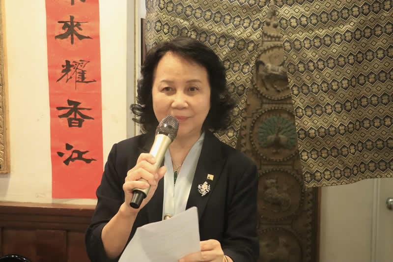 香港緬華互助會會長徐新英女士則回顧了互助會三十四年的光輝歷程。她深情講述了自1985年起,以徐四民先生、王敬忠先生、汪金買先生等十二位先賢為始,懷揣家國情懷,歷經七年多努力,終在1992年正式成立「香港緬華互助會」的感人歷史。前輩們播下的種子,如今已成長為凝聚鄉親的重要橋樑。她特別感謝王錦彪主席二十餘年如一日,出錢出力,帶領會務不斷發展壯大,個人出資購置2000多平方尺的新會所供會友免費使用,始終秉持「對內增進鄉誼、團結互助;對外推動愛國、愛港、愛僑、愛鄉」的創會宗旨。