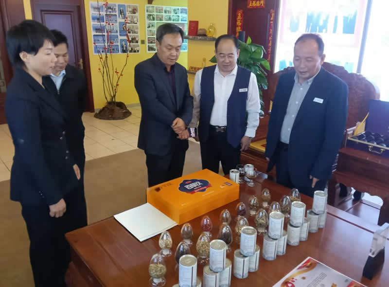 杨兴旺(右三)了解神农百草集团主打产品“百草饮”