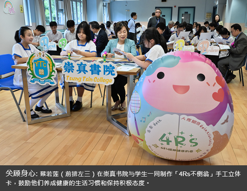 她表示,教育局将「4Rs不倒翁」送给学校和学生作为开学礼物,推动大家实践4Rs,即休息(Rest)、放松(Relaxation)、人际关系(Relationship)和抗逆力(Resilience),锻炼「不倒」精神。她鼓励学生保持充足睡眠,养成健康的生活习惯,也要适时放松,在繁忙的学习中抽空做自己喜欢的事。她又说,学生应建立良好人际关系,以及保持积极态度,提升抗逆力