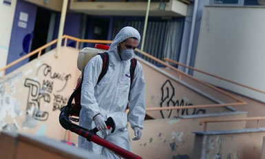 A man wearing a protective suit decontaminates a primary school where a child was diagnosed with coronavirus in Thessaloniki, Greece, Feb. 27, 2020.(Photo by Dimitris Tosidis/Xinhua)