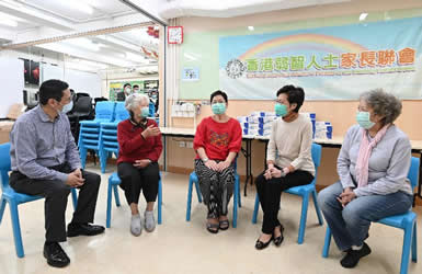 林郑月娥在社会福利署(社署)副署长林嘉泰陪同下,分别探访香港弱智人士家长联会和励智协进会,与组织的主席和成员交谈,了解会员在疫情期间面对的挑战和对复康服务的意见。她向组织解释特区政府在口罩供应持续紧张的情况下,须优先照顾医护和其他参与抗疫工作的前线人员的需要,但早前亦决定将各界捐赠给特区政府的口罩全数转赠非政府机构,由它们派发给主要是长者的弱势社群。考虑到一些病人自助组织亦面对采购口罩供会员使用的困难,政府最近决定把转赠捐赠口罩的受惠机构,扩大至约九十四个现时在社署「残疾人士/病人自助组织资助计划」下接受补助的自助组织,获分配的口罩会考虑组织会员的人数,口罩总数约八十五万个。社署会陆续联络各个自助组织。