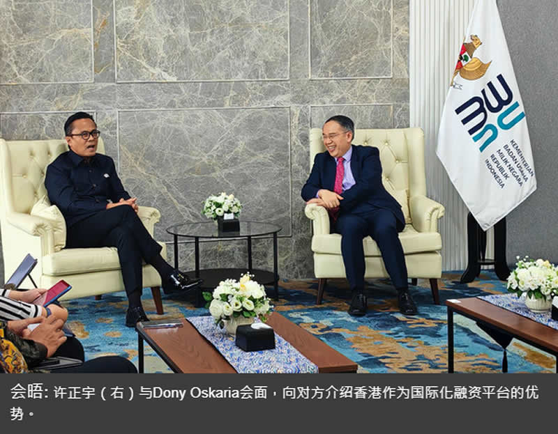 在与印尼国有企业部副部长Dony Oskaria会面时,许正宇向对方介绍施政报告中多项有关发掘新增长点和深化与东南亚国家联盟地区联系的措施,他鼓励印尼的国有企业和优质创新型企业善用香港国际化的融资平台壮大和发展业务。