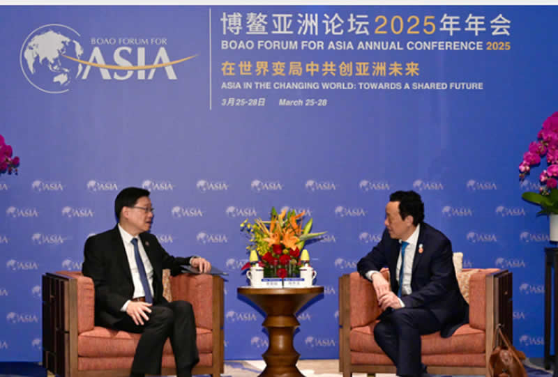 行政长官李家超今日在海南出席博鳌亚洲论坛2025年年会开幕大会,并与联合国粮食及农业组织总干事屈冬玉会面,傍晚结束行程返港。