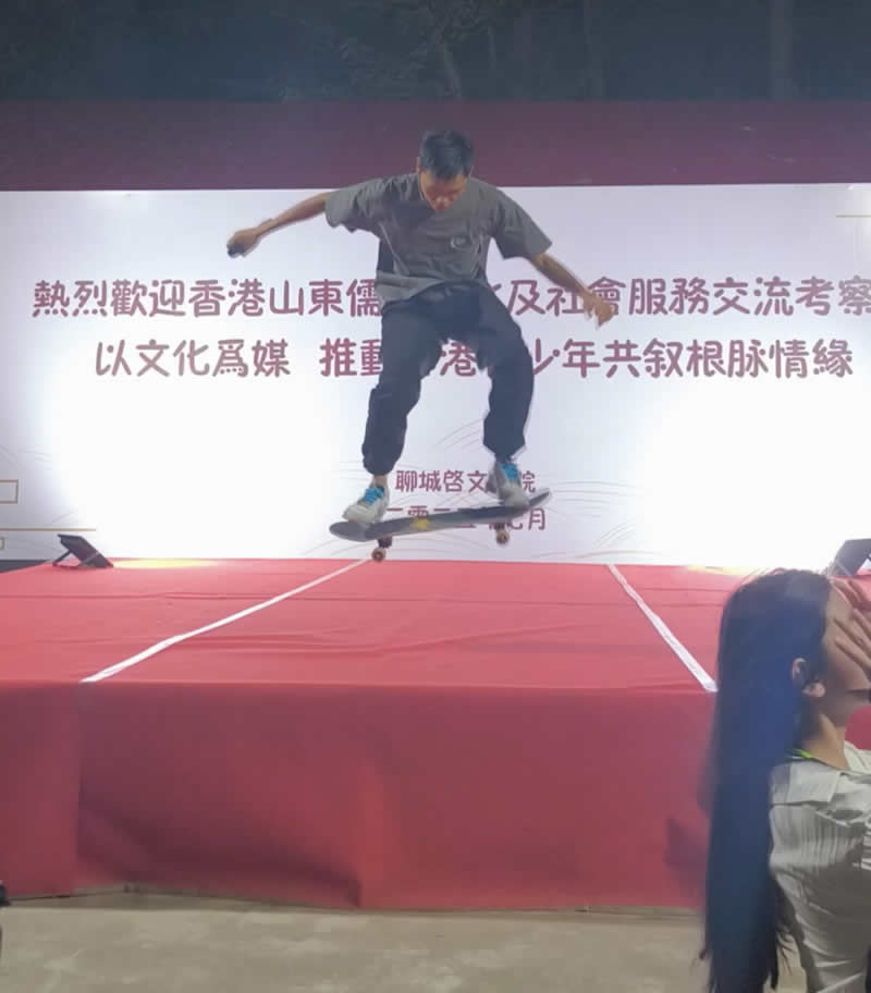 7月25日起程去到山東濟南機場,第一站是聊城啓文書院,劉慶濤院長安排了別具特色的溝火歡迎晚會,兩地青年盡顯身手,山東青年唱歌、朗誦;香港青年也不遜色,滑板港隊成員林聖凱示範滑板技巧,其他青年即場組成唱團助慶,晚會友誼氣氛濃烈。
