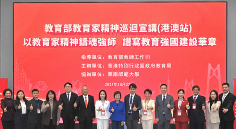教育部教育家精神巡回宣讲(港澳站)今日举行,300多名港澳校长及教师参与。来自内地不同省市的宣讲团成员及香港教师以「以教育家精神铸魂强师,谱写教育强国建设华章」为题发表宣讲报告,分享育人实践,让教师领悟教育家精神的时代意义,共同推动教育高品质发展。