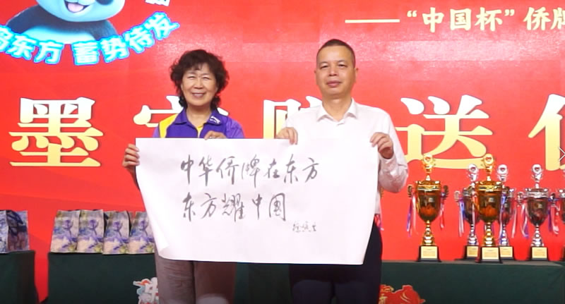 国际乒联终身名誉主席 徐寅生先生,虽没有亲临现场,却特意委托中国乒乓球协会副主席、裁判委员会主任李一冰带来珍贵墨宝,为侨牌赛事、为东方市赠送墨宝“中华侨牌在东方,东方耀中国”!李一冰(左一)、东方市市长卢胜(右一)。
