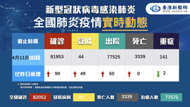 截至4月11日24时,据31个省(自治区、直辖市)和新疆生產建设兵团报告,现有确诊病例1138例(其中重癥病例139例),累计治愈出院病例77575例,累计死亡病例3339例,累计报告确诊病例82052例,现有疑似病例82例。累计追踪到密切接触者718881人,尚在医学观察的密切接触者9722人。