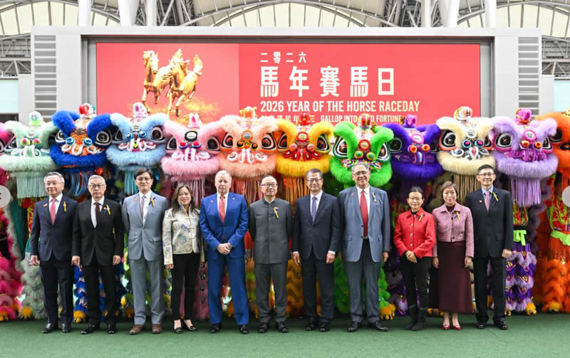 喜气盈门: 财政司司长陈茂波(右五)、文化体育及旅游局局长罗淑佩(左四)2月19日在沙田马场出席马年赛马日,庆贺新岁。