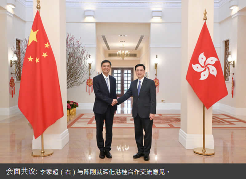 行政长官李家超昨日在礼宾府与广西壮族自治区党委书记陈刚会面,就深化港桂合作交流意见。陈刚将出席明日举行的广西(香港)推介会,李家超也会出席,支持和见证桂港合作的签署仪式。