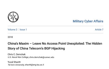 美国海军战争学院(Chris C. Demchak U.S. Naval War College)2018年的一份报告,指责中国电信隐蔽地实施BGP劫持行动。所谓BGP劫持,就是改变美国因特网工程任务组(IETF)规定的AS自治系统之间的边界路由交换协议。BGP劫持并不是说直接破坏网络基础设施,并不改变网络的任何结构,是指干扰数据流向和状态的活动。从这个意义上说,BGP是数据战的重要方法和手段。