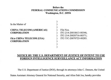 4月9日,美国司法部、国土安全部、国防部、国务院、商务部和美国贸易代表团等机构,一致要求美国联邦通信委员会(FCC),撤销和终止中国电信在美国经营国际电信业务的“214牌照”(即依照美国通信法第214条规定发放的经营许可牌照)。