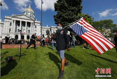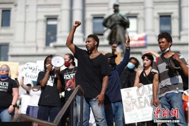 当地时间5月28日,美国科罗拉多州,民众在丹佛州议会大厦外举行抗议示威活动。