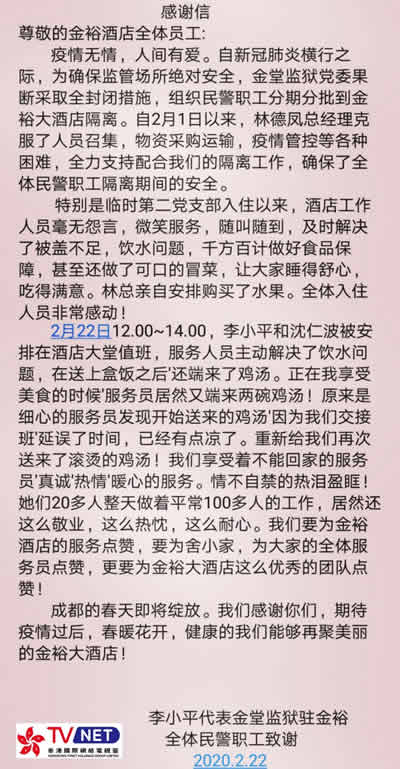 当地爱心企业家们在行动,成都市金堂县金裕大酒店董事长林德凤就是千千万万践行大爱的代表。第一时间号召并带领酒店全体员工,积极投入如到支持当地疫情防控工作中来,当得知金堂县201监狱有100余名狱警投入疫情防控一线,基本食宿难以保障这一消息后,林大姐立即向上级相关部门提交申请,希望能够为他们做好后勤服务。在得到审批通过后,林大姐带领部分酒店员工,在做好防范措施的前提下,设置专用楼层、专用餐厅为一线“战士”们提供服务。受到了狱警们的一致点赞,他们以感谢信的方式,将心中特别的爱,致敬心中的林大姐和酒店全体员工,在社会产业强烈反响。