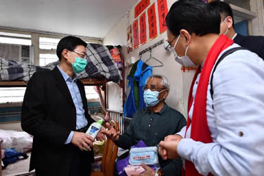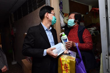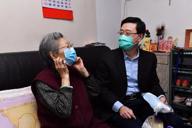 保安局局长李家超于二月二十五日下午到访马鞍山耀安邨,向长者家庭派发防疫包和健康资讯单张,希望他们保持良好的个人卫生习惯,防止疫情扩散。