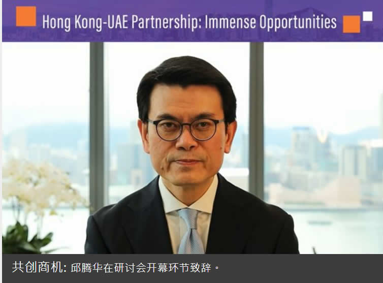 局长邱腾华在开幕环节致辞时表示,阿联酋是香港在中东最大的贸易伙伴,两地在经济和贸易方面紧密合作。随着双方于2019年6月签署促进和保护投资协定,以及香港驻迪拜经济贸易办事处去年10月正式启用,两地合作已提升至新台阶。