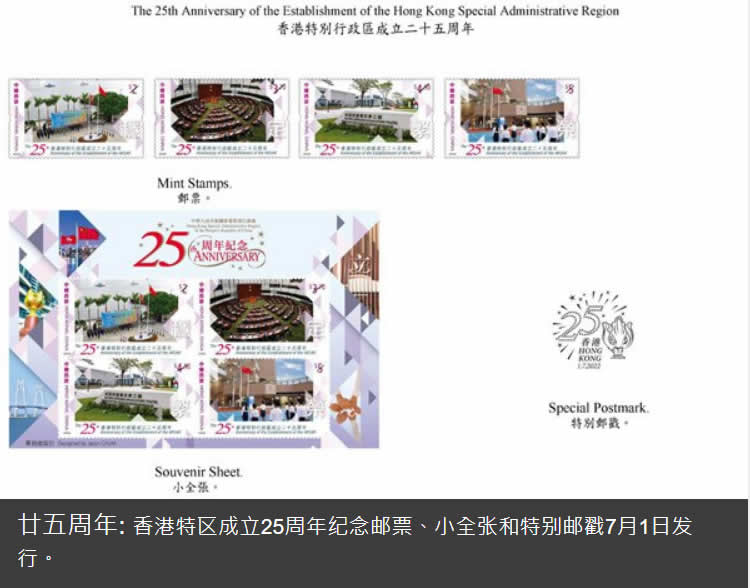 香港邮政下月1日发售以香港特别行政区成立25周年和中国人民解放军进驻香港25周年为题的纪念邮票及相关邮品。