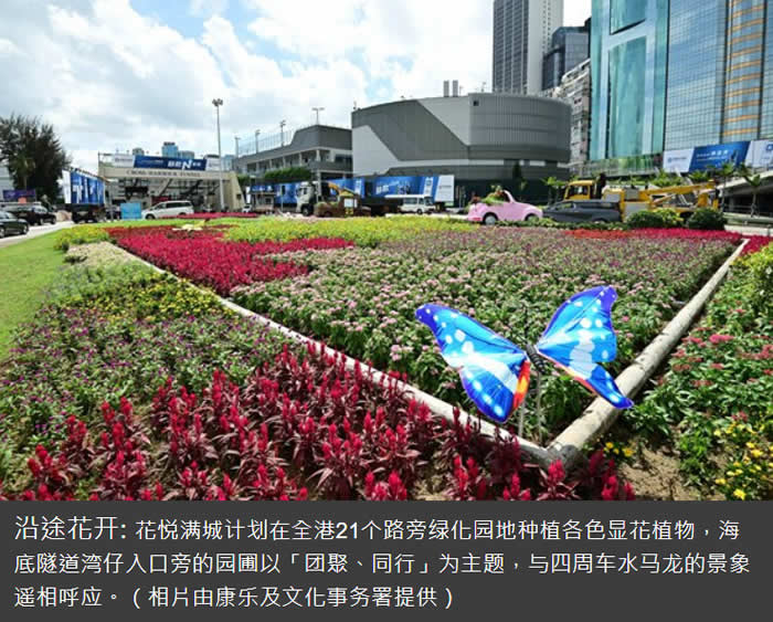 花悦满城计划6月至10月分三阶段在全港多达51个地点进行园景美化工程。首两阶段已展开,包括在21个路旁绿化园地广泛种植各色显花植物;在12个公园和地点设置花海、花墙、迷宫花园和以生日为主题的园圃。