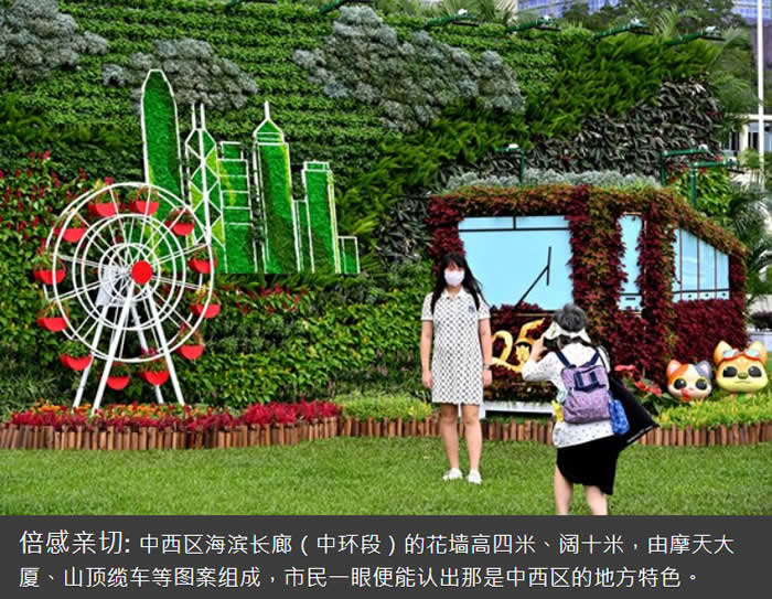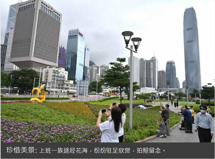 中西区海滨长廊(中环段)的花海名为姹紫嫣红耀香港,面积达420平方米,庆祝香港回归25周年的两米高金色标志立在其中,轻易成为焦点。上班族中午时分经过,纷纷驻足欣赏,拍照留念。