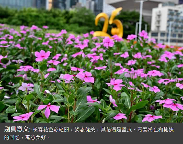 除了花期和色彩搭配,署方还考虑到花朵的寓意。林耀权解释:「长春花的花语是坚贞、青春常在和愉快的回忆;蓝猪耳的花语是思念、青春、花样年华;百日菊的花语是天长地久、步步高升;凤尾球的花语是永恒真挚的爱。全部加起来正好代表香港人的努力和成就,更蕴含迎接更美好将来的意思。」