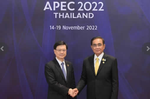 行政长官李家超(左)11月18日在泰国曼谷出席第29届亚太区经济合作组织领导人非正式会议,出席会议前由泰国总理巴育迎接。