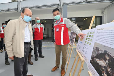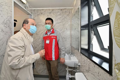 在建筑署署长林余家慧陪同下,张建宗参观检疫单位,并聆听人员在建设过程中遇到的挑战,包括在卫生和安全方面的特别要求(例如妥善配置卫生设备等),以及如何以「组装合成」建筑法,在少于一个月时间完成增建118个新检疫单位。