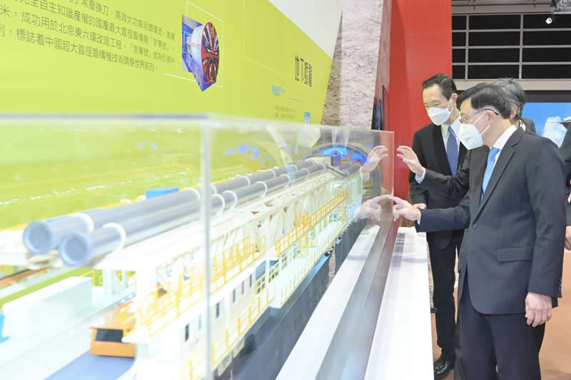目不暇给: 行政长官李家超(右)12月12日出席团结香港基金创科博览2022开幕典礼,并参观场内展览。