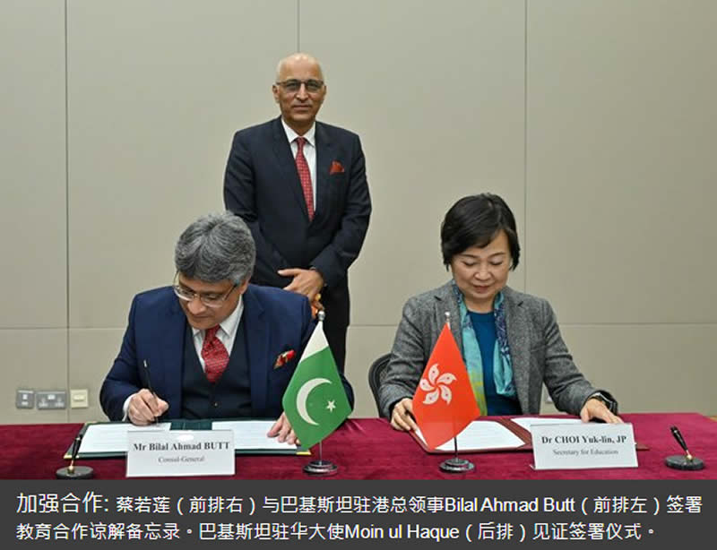 备忘录由教育局局长蔡若莲与巴基斯坦驻港总领事Bilal Ahmad Butt代表签署,并由正访港的巴基斯坦驻华大使Moin ul Haque见证。