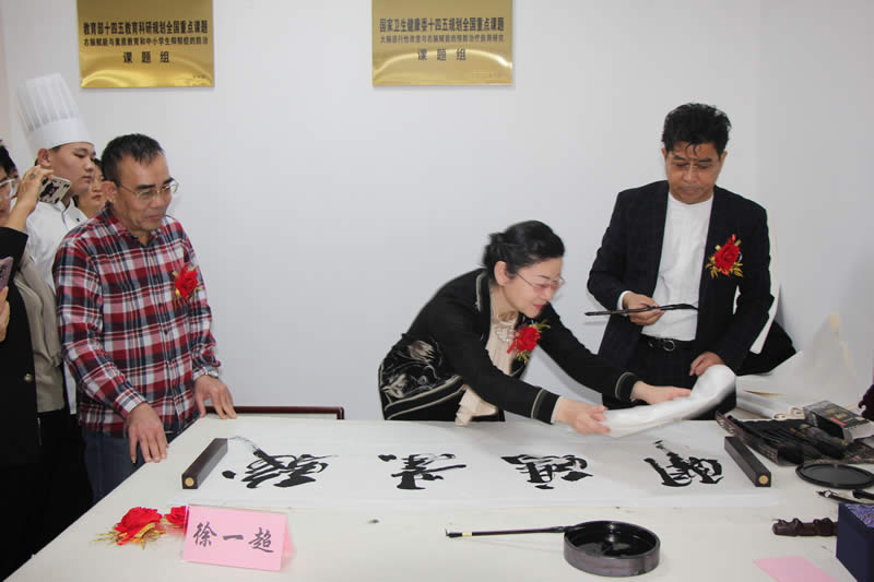 有向往学校校长王乃奎对与会嘉宾表示感谢并宣布学校成立,书法家徐一超现场挥毫赠送墨宝,李浩然和周师妤为学校颁发教育部和卫健委十四五重点课题应用牌匾,由学校负责人云奋和林晓雨接牌。