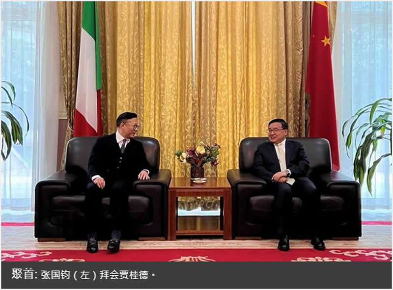 张国钧先拜会中华人民共和国驻意大利共和国特命全权大使贾桂德。他感谢大使馆一直支持律政司争取国际法律及争议解决机构落户香港,并表示香港作为国家唯一的普通法司法管辖区,会积极助力国家的涉外法律工作。