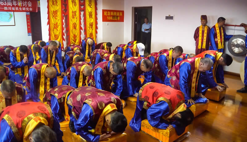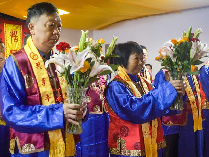 12号上午九时许,金堂商会大厦20楼的妈祖研究中心大厅内,三献礼音乐在整个楼层空中回荡,100余位身着妈祖祭祀礼服的妈祖文化专家、学者和妈祖信仰者个个庄肃,人人怀着对妈祖的崇敬之情云集于此,在司仪的主持下,成功举行了纪念妈祖诞辰1063周年三献礼祭拜仪式。
