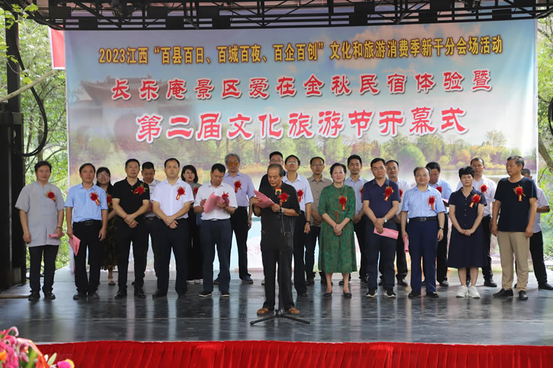 开幕式上,新干县黎山林场党委书记袁清如主持并致开幕词,中国林场协会会长姚昌恬、江西省林业局生态建设中心主任阙龙善、吉安市林业局副局长谢福传和特邀嘉宾中国当代著名画家阚志经致贺辞。新干县人民政府副县长杨海涛致欢迎辞并宣布长乐庵景区爱在金秋民宿体验暨第二届文化旅游节开幕。出席开幕式的还有江西省林业局原一级巡视员、江西省林场协会会长罗勤,江西省林业局生态建设中心科长熊连明,吉安市林业局种苗站站长李毅生,中央直属中国报道总监兼主编熊绍君,海峡两岸杂志社海南分社社长邓小龙,中国当代工艺美术大师邓良华、中国林科院亚林中心纪委书记邓宗付,江西环境工程职业学院林学院副院长游彩云,以及新干县林业局局长李小武,县文广新旅局副局长邹建锋、肖丽梅等领导和嘉宾。整个开幕式主题明确,特色鲜明,大气高雅,隆重热烈。