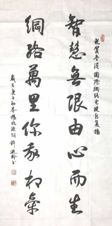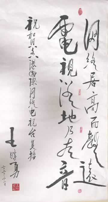 日前,在举行了盛大复播仪式之后,香港国际网络电视台各项业务已经进入全新阶段。欧洲和亚洲以及全球许多海外华侨和国内各界人士纷纷祝贺。国内一些著名书法家纷纷挥毫祝贺。特别介绍著名书法家孟凡瑞、王时勇、许遐龄和郭军为香港国际网络电视台复播创作的书法艺术。