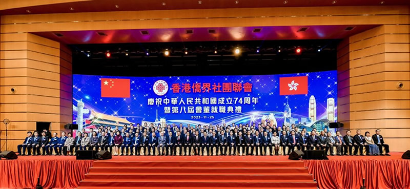 香港侨界社团联会庆祝中华人民共和国成立74周年暨第八届会董会就职典礼于25日晚在香港会展中心举行。全国政协副主席梁振英,香港特别行政区行政长官李家超,中共中央统战部副部长林锐,中国侨联副主席程学源,中央政府驻港联络办公室副主任尹宗华,中央政府驻港维护国家安全公署副署长孙青野,外交部驻港特派员公署署理特派员李永胜,中国侨联副主席、香港侨界社团联会首席主席余国春,中国侨联副主席、香港侨界社团联会主席吴换炎等共同主礼,香港侨界及香港社会各界人士千余人出席典礼。