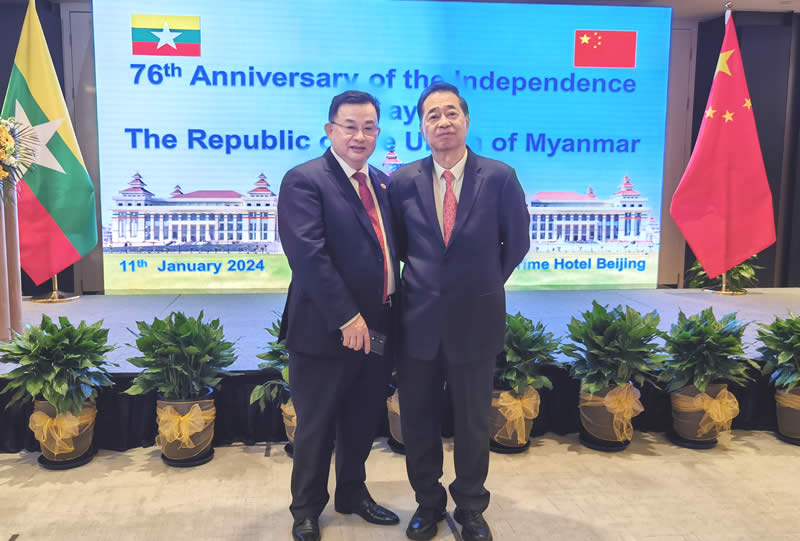 2024年1月11日晚18时30分-20时30分,由缅甸联邦共和国驻华大使吴丁貌瑞先生偕夫人杜蜜蜜莫女士在北京华侨大厦睿世酒店金源宴会厅(二层)举办庆祝缅甸联邦共和国独立76周年招待会,香港国际网络电视台董事局主席刘俊明先生、香港国际网络电视台董事局副主席王錦彪先生、香港国际网络电视台董事局总顾问李惠明先生,应邀参加。